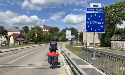 Wie gewöhnlich, wenn wir mal ein festes Dach über dem Kopf haben, reizten wir die Check-Out-Zeit bis auf die letzte Minute aus und radelten aus der Kulturhauptstadt Kaunas in Richtung Ukmerge raus. Wir versuchten die vermeintlichen Vorzüge der Zivilisation zu nutzen, um an einen Corona-Test zu kommen. Haben wir in Berlin noch darüber schmunzeln müssen, dass jeder Dönerladen, Antiquitätenhändler, Puff oder auch ein Lastenrad ein Testangebot hat, merkten wir, dass das in Litauen nicht ganz so einfach ist. Sowohl an der Touristeninfo als auch bei einem Testzentrum selbst, konnte man uns „so kurzfristig“ nicht weiterhelfen. Nachdem wir mit der offiziellen Hotline telefoniert hatten realisierten wir, dass es an diesem Tag nichts mehr mit einem Test wird. Etwas ernüchtert fuhren wir in Richtung Ukmerge. Leider gibt es in Litauen kaum Fernradwege und so hatten wir nach längerer Recherche online eine Navigationsroute von Vilnius nach Riga gefunden. Auf diese Route wollten wir bei Ukmerge stoßen. Auf dem Weg dorthin musste improvisiert werden. Wir schoben unsere Räder über sandige Waldwege, fuhren ein Stück Autobahn und mussten uns bei einer Brücke auf dem Gelände einer Kiesgrube dünn machen, bevor wir die vollbepackten Räder auch noch über eine Autoschranke heben mussten. Zwischendrin waren wir froh, als wir einen netten Rastplatz in einem Waldstück fanden mit sehr netten Holzskulpturen. Die Pause versüßten wir uns mit dem Olympialivestream, was mit unserer neuen tollen SIM-Karte überall möglich ist.