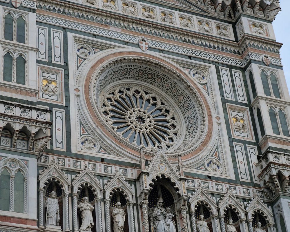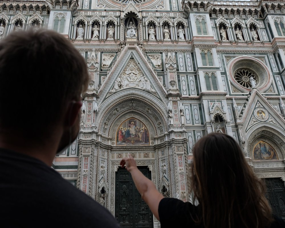 Dort angekommen stellten wir unsere Räder schnell in der Unterkunft ab und begaben uns auf Stadterkundung. Mit der Bahn fuhren wir direkt in die Innenstadt (Haltestelle Unità) und spazierten in Richtung Kathedrale, deren gigantische Kuppel wir bei der Abfahrt nach Florenz schon aus der Ferne bewundert hatten. Wir setzten uns direkt vor den Haupteingang und bewunderten die gigantische Fassade. Die Anzahl der Darstellungen und Figuren ist überweltigend und das Meme-Potenzial dabei sehr groß (siehe Bild). Durch die Innenstadt zogen wir - inzwischen hungrig - weiter über den Fluss Arno zur Pizzaria Gusta. Die Karte bestand aus 5 Pizzen, Bier und Aperol Spritz. Bis auf eine Pizza aßen und tranken wir alles davon. Es war köstlich! Müde und gesättigt fuhren wir zurück zum Hotel. Das (mittags noch sehr motiviert formulierte) Vorhaben Wäsche zu waschen wurde kurzfristig auf unbestimmt Zeit verschoben, nur Vincent wühlte und schrubbte noch bis 1 Uhr nachts im Badezimmer, weil er es für eine gute Idee gehalten hatte vor der Florenzbesichtigung seine komplette Wäsche im Waschbecken einzuweichen.