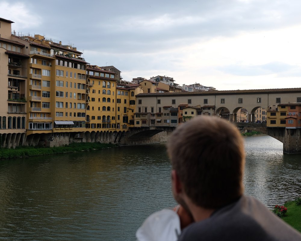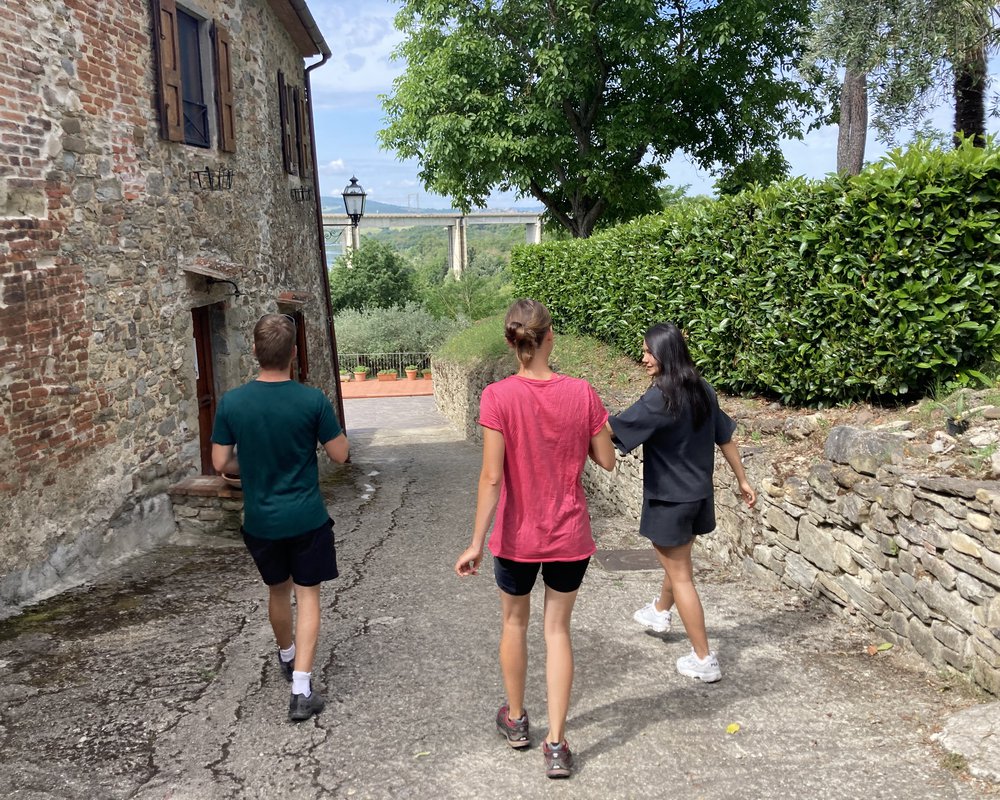 Irgendwann wurden wir dann wieder vereint und auch Vincent, der mittlerweile auch eine Dusche von innen gesehen hatte, gesellte sich zu uns. Dann wurde es lustig. Da aktuell 33 Personen in Rondine leben, kamen immer wieder neue Menschen durch die Türe und gesellten sich zu uns. Uns wurde ein Obstteller und Tee gebracht und wir wurden mehrmals gefragt, warum wir überhaupt hier waren. Das wussten wir selbst nicht so genau. Immer, wenn wieder eine neue Person durch die Türe kam, durfte Jared von vorne erzählen, wer wir sind, was wir machen und wie wir hier hergekommen sind. Zwischendrin wurde der Beamer angeworfen und ein Film angemacht, den wir aber nur bis zur Hälfte anschauten, weil es schon spät war und wir uns lieber noch unterhalten wollten. Irgendwann hatte sich wohl herumgesprochen, dass „3 German guests“ sich nach Rondine verirrt hatten und so kamen weitere Menschen und fragten uns: „are you the Germans?“. Jareds Geschichte, die er im Insgesamten bestimmt 10 mal erzählt hat, war zu später Stunde schon sehr smooth und oft reichte es aus, wenn wir einfach sagten: „We are the Germans“. Manchmal kam uns auch Juliana mit der Erklärung zuvor und sagte, dass sie uns gefunden hat, uns sympathisch fand und uns deshalb gekidnappt hat. Viel zu spät gingen wir dann in unser Zelt und verabredeten uns zu einem morgendlichen Kaffee und einer Führung über das Gelände. Der Häuserkomplex ist einsam im Wald gelegen mit einem gigantischen Blick über einen Fluss. Die Gebäude sind alte Steingemäuer und in sich verwinkelt, was dem ganzen Charme verleiht. Es gibt sogar eine kleine Cafeteria, wo Frühstück und Mittagessen serviert wird. Schweren Herzens verabschiedeten wir uns schließlich von Juliana und den anderen Frühaufstehern (10 Uhr ;-) ) und machten uns auf den Weg nach Florenz.