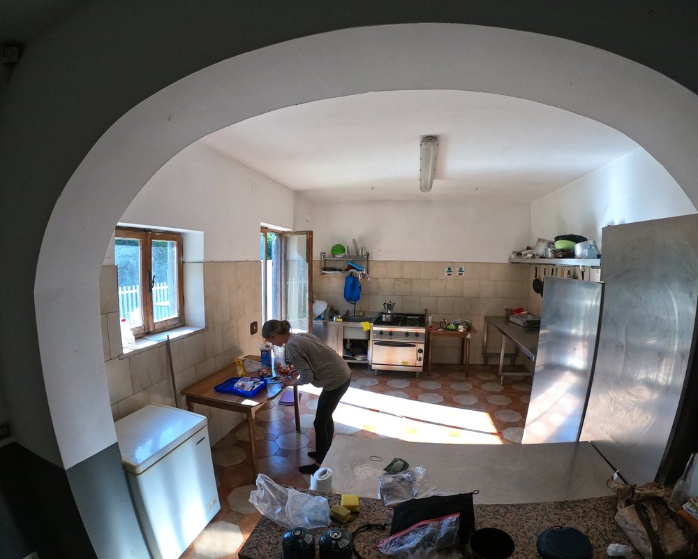 Verunsichert passierten wir das geöffnete Stahltor und gingen die sehr lange Allee hinunter zum Anwesen. Katha summte Hotel California vor sich hin, wir wussten noch nicht, wie sehr Recht sie damit haben wird. Dort bemerkten wir zuerst ein riesiges Haus, das jedoch komplett verschlossen war. Daneben war eine ebenfalls riesengroße Wiesenfläche, die super zum Campen geeignet gewesen wäre. Wir versuchten noch jemanden dort zu finden und liefen schließlich zum kleineren Haus dahinter hinunter. Dort wurde Vincent dann jedoch direkt von Wachhunden in Empfang genommen und zurückgebellt. Soeben ertönte ein Pfiff und ein älterer Mann names Alfonso beruhigte die Hunde damit direkt. Da er kein Englisch verstand, zeigten wir ihm auch wieder einmal unseren vorgefertigten Text. Während er laß, gab er bereits einen Daumen hoch (ich vermute was die Spendenaktion betrifft... an dieser Stelle schon mal ein herzliches Dankeschön an alle, die sich bereits beteiligt haben!!). Danach führte er uns zu der Wiese und signalisierte uns, dass wir da schlafen dürfen. Er zeigte uns auch ein Badhäuschen, das wir nutzen können. Während er uns alles erklärte, überlegte er doch noch einmal kurz und fragte schließlich ob wir im Casa grande schlafen wollen. Es sei ‚no problemo‘. Wir willigten ein und kurze Zeit später standen wir in dieser riesigen Herberge, die wohl sonst für Pfadfinder Aktionen oder ähnliches genutzt wird. Wir durften die Küche mit Gasherd, sowie sogar warme Duschen verwenden und an Schlafplatz mangelte es ebenfalls überhaupt nicht. Voller Freude und etwas fassungslos, wieviel Glück wir mal wieder hatten, machten wir es uns bequem und starteten mit dem Abendessen.