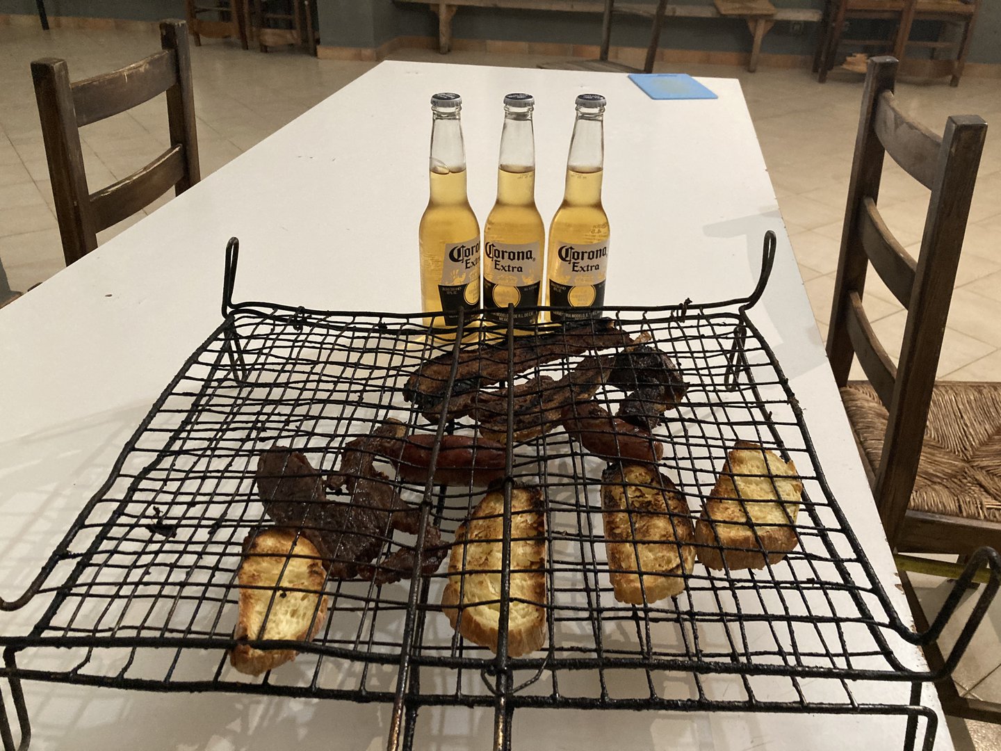 Wenig später kam sein Sohn Sandro vorbeigefahren und erkundigte sich, ob wir noch irgendwas benötigen. Da Sandro sehr gut Englisch spricht, konnten wir uns bestens unterhalten. Er zeigte uns auch nochmal alles wichtige und versicherte uns, dass wir ihn jederzeit anrufen können, wenn wir noch was brauchen. Schließlich fuhr er wieder fort und Alfonso kam nochmal herein. Er bemerkte, dass wir bereits Nudeln im Kochwasser und Zucchini in der Pfanne hatten. Er fragte uns etwas mir ‚Carne‘ (Fleisch) aber wir signalisierten ihm ‚tutto bene‘. Das schien ihn wohl nicht zufrieden zu stellen und etwa 30 Minuten später kam er wieder mit einem Gitter voll gegrilltem Fleisch und Brot und 3 Bier.