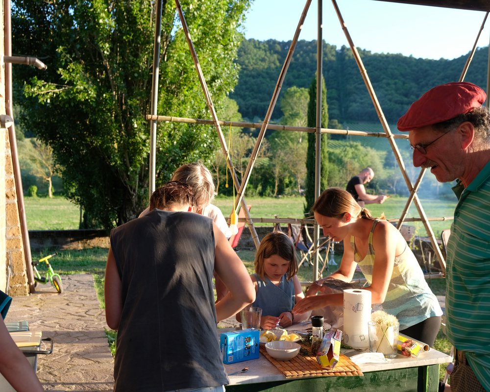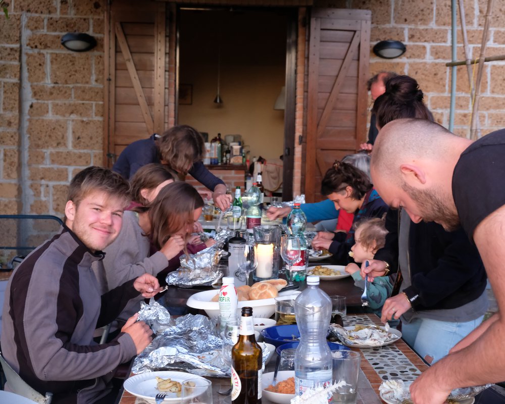 Schließlich legten wir auch noch die letzten Kilometer zurück bis zu Siggi und Birgits herrlicher Urlaubsbutze. Dort wurden wir zum Abendessen eingeladen, tobten uns zuerst aber noch im anliegenden Swimming Pool aus. Die ganze Familie von Siegfried und Birgit war mit angereist (Töchter und Enkel) und so bildete sich ein gewaltiges Essensbanket aus. Zu essen gab es frischen Fisch vom Grill, gefüllt mit Zitrone und Rosmarin und dazu Kartoffeln mit Tomaten und Oliven Snacks... ein Traum! Johanna bot uns schließlich sogar noch einen Raum in ihrem Haus an, da fiel die Schlafplatzsuche weg und der Hauswein konnte entspannt genossen werden. Spät, aber nach sehr interessanten Gesprächsrunden mit dieser herzigen Familie ging’s dann ins Bett. Am nächsten Tag gehts dann hinter Montefiascone weiter in Richtung Florenz.