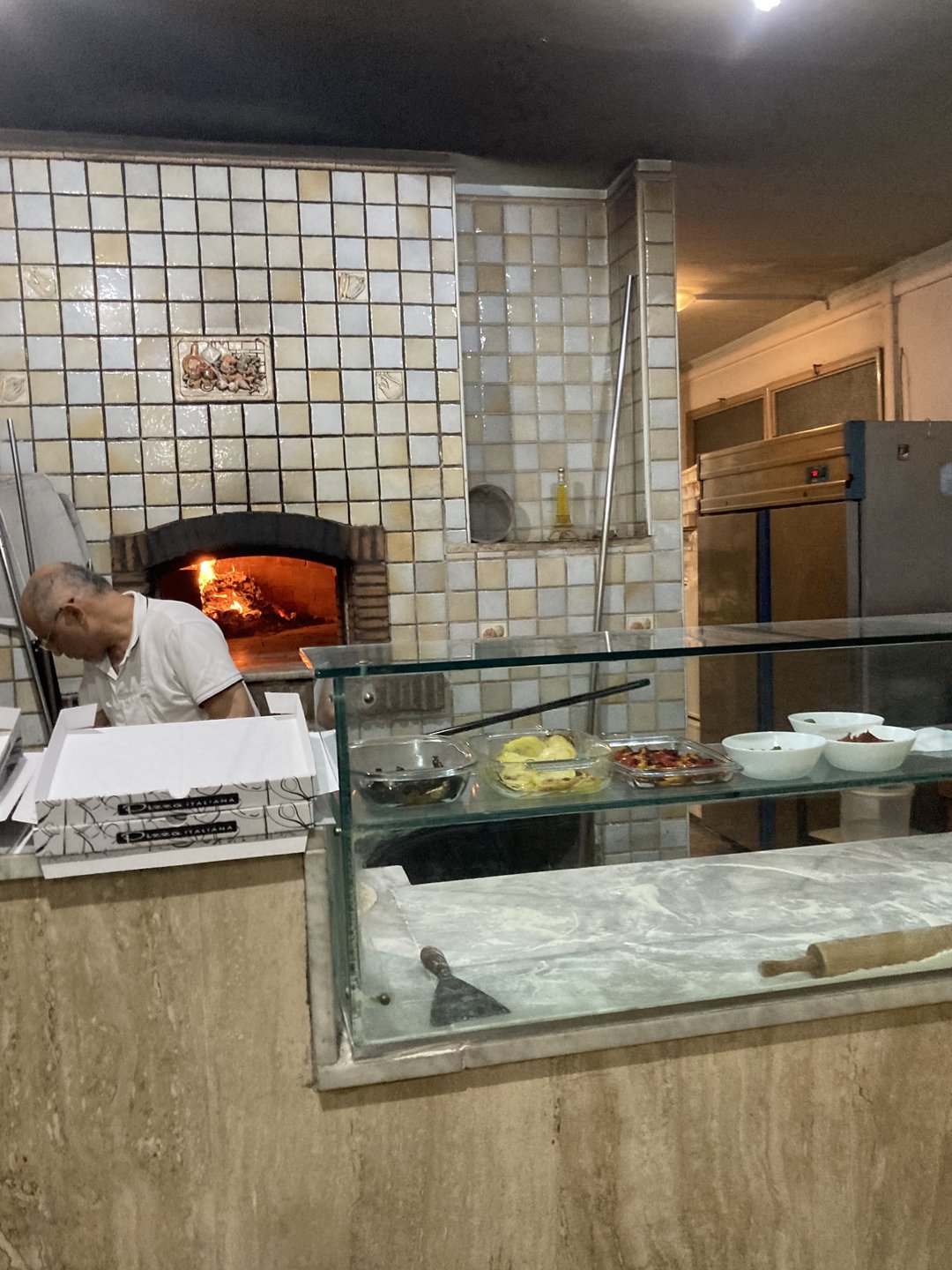 Wir kamen gestern spätabends am Campingplatz an und waren nicht mehr wirklich in der Lage zu kochen, also beschlossen wir Pizza zu essen. Da die Pizzaria auf dem Campingplatz schon sehr bald schloss, fuhr ich zur nächstgelegenen Pizzeria um Pizza zu holen. Ich fand eine wunderschöne kleine Pizzaria in einer Nebenstraße. Eigentlich bestand der Laden nur aus einem gigantischen Holzofen und einer kleinen Theke. Ich war total gerührt von der Hingabe und Liebe mit der der Ladenbesitzer unsere Pizzen zubereitete und die Technik mit der er die Pizzen in zwei Meter tiefe hinten im Ofen drehte. Er schenkte uns zur Bestellung noch ein weiteres Bier und half mir meinen Gepäckträger mit den Pizzen zu beladen.