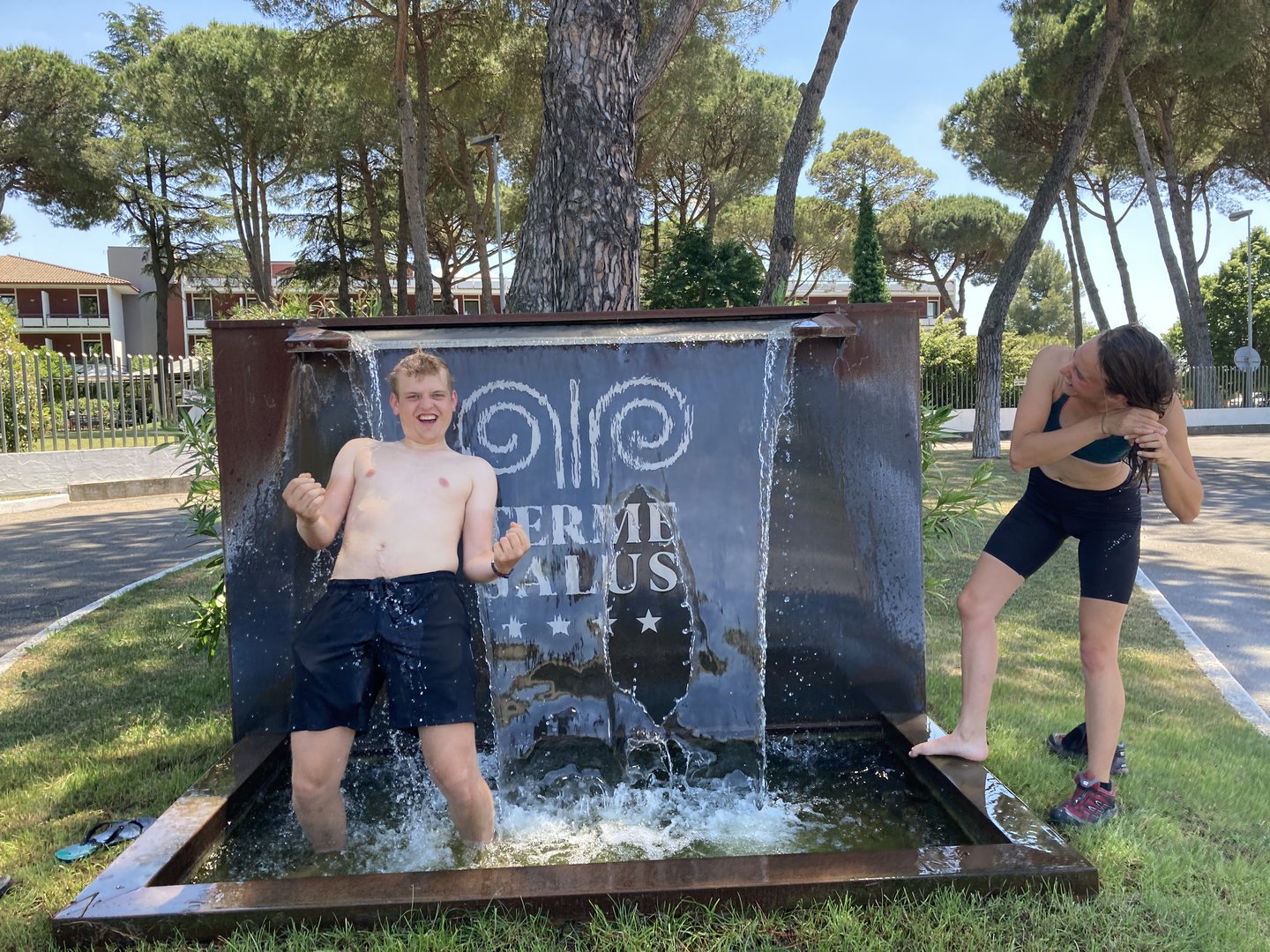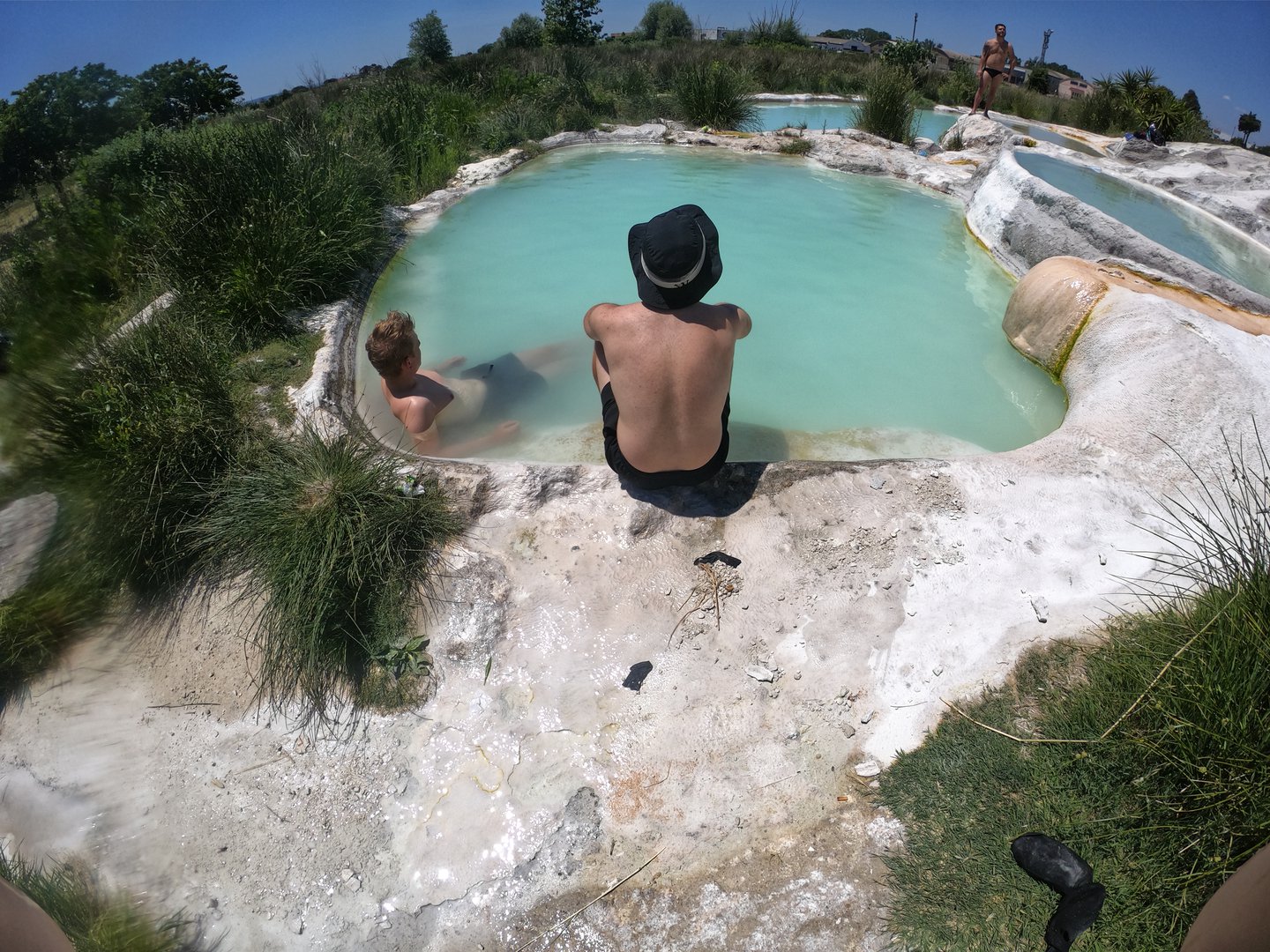Heute ging es schließlich nach Montefiascone und die Etappe war insgesamt überschaubar. Daher blieb etwas mehr Zeit, um die Gegend etwas genauer zu besichtigen. Eine Sache, die wir unbedingt noch anschauen wollten, waren die Schwefelquellen bei Vinterbo. Dort strömt zwar heißes Wasser aus dem Boden, jedoch ist der Schwefelgeruch auch sehr dominant und es stinkt stark nach faulen Eiern. Am ersten Spot war die Quelle abgezäunt und es floss kaum Wasser heraus, daher waren die Naturbäder leer. Am zweiten Spot wurden wir schließlich fündig. Obwohl das Gebiet eigentlich gesperrt war, fanden wir 2 andere Mitbadende dort und so gingen wir dann auch noch eine Runde ‚schwefeln‘.