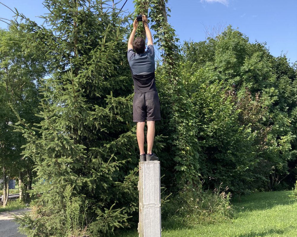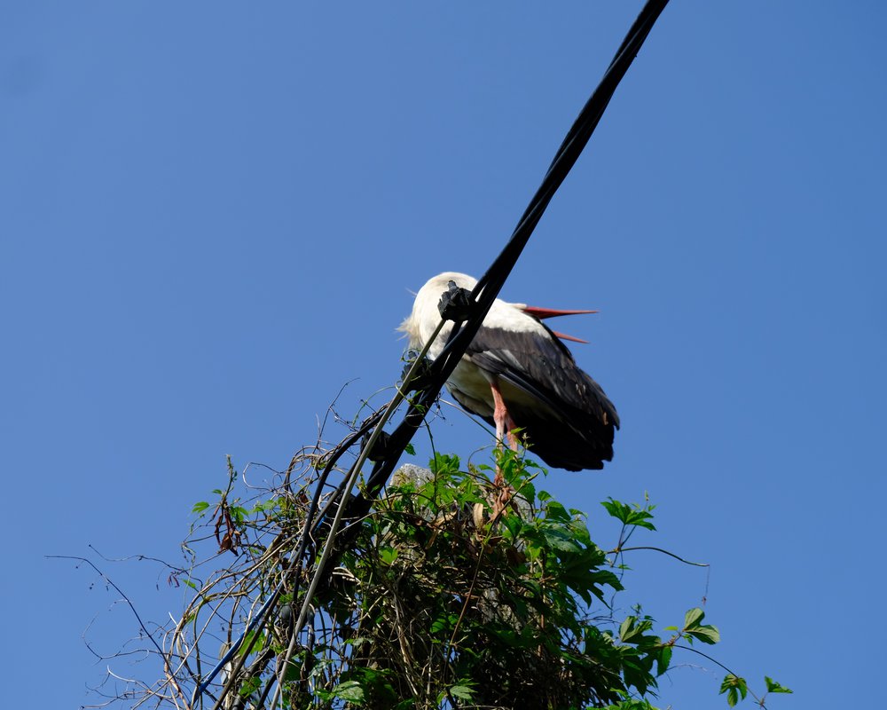 Da wir für den Tag bereits genug erlebt, aber noch viel zu wenig Strecke hinter uns gebracht hatten, ging es nun weiter. Wir folgten wieder dem Green Velo, welcher uns auf gut befahrbaren Feldwegen und Straßen ohne Verkehr nach Osten führte. Unsere einzige längere Pause machten wir an einem Fahrrad-Rastplatz. Dort waren wir fasziniert von einem Paar Storche, die an ihrem Nest werkelten. Allgemein war die Menge dieser schönen Vögel in den letzten Tagen extrem hoch gewesen. In jedem Dorf fanden sich mehrere Storchennester und auf jedem Feld waren die Tiere zu sehen. Eine kurze Recherche ergab, dass Polen auch als „Land der Weißstorche“ bezeichnet wird. Etwa 25% der Weltpopulation an Weiß- bzw. Klapperstorchen sei hier zu finden. Ich versuchte natürlich, die Vögel zu fotografieren und näherte mich dabei so gut es ging ohne sie zu verscheuchen - im Nachhinein muss ich zugeben, dass die Aktion wohl etwas bescheuert aussah.
