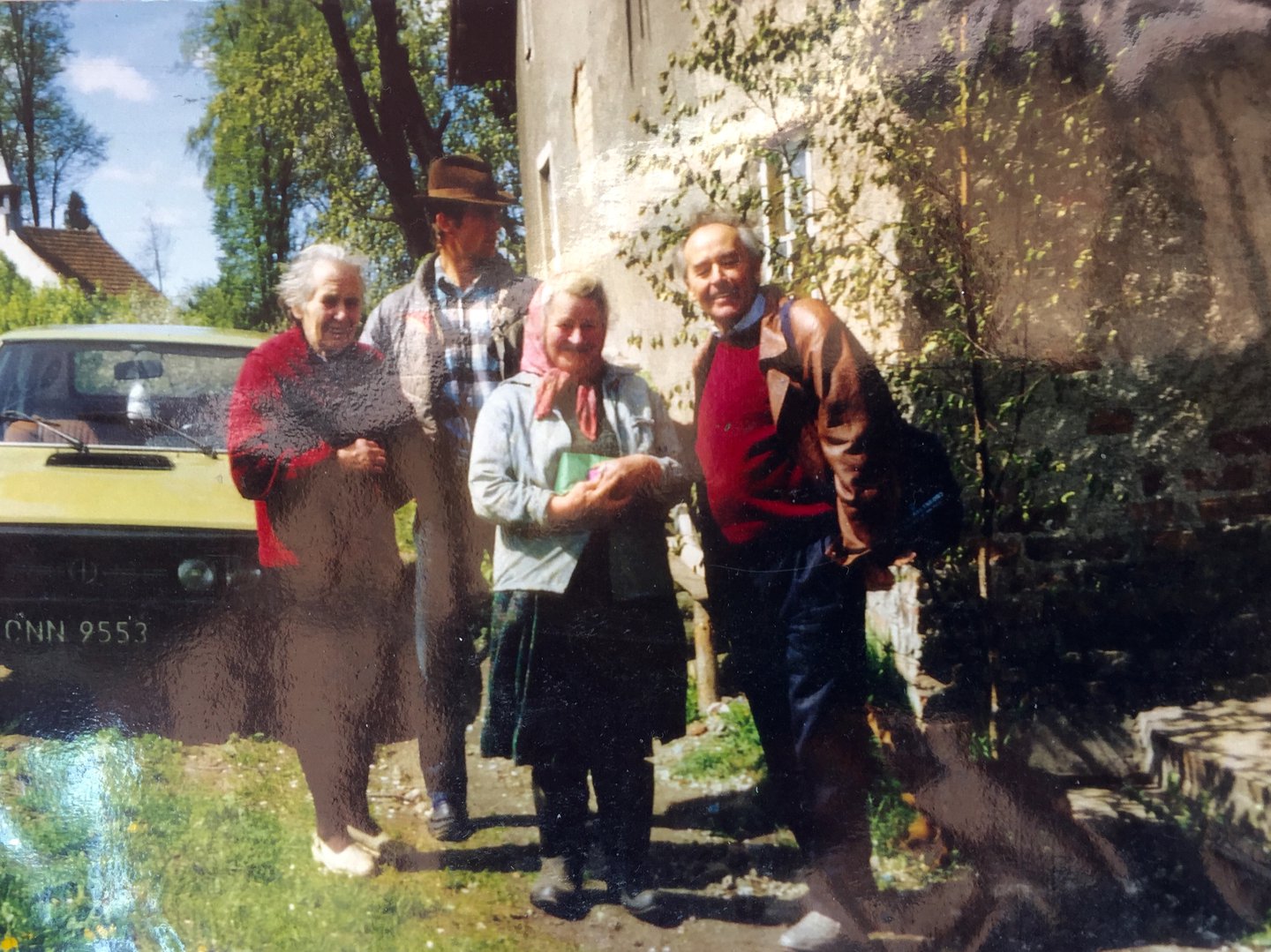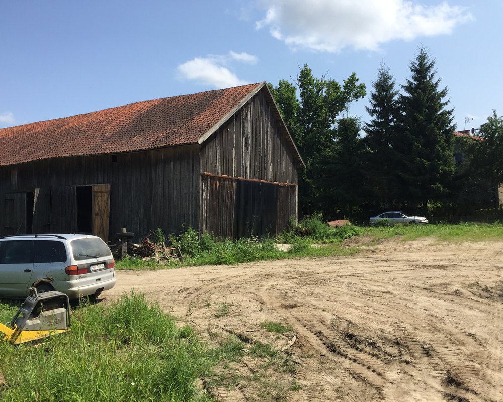 Im ganzen Dorf sahen wir keine Menschen. Einzig an einem sehr alt aussehenden Hof trafen wir den Besitzer desselben, was sich als beinahe astronomischer Zufall herausstellen sollte. Zu unserer Überraschung sprach er einige Worte englisch (nach eigener Aussage als einziger im Dorf) und war durchaus interessiert an meiner Geschichte. Ich zeigte ihm eine alte deutsche Karte der Umgebung, die ich online gefunden hatte und er studierte sie fleißig. Leider half das nicht groß weiter und auch die Namen „Spannenkrebs“ und „Tresch“ (Mädchenname meiner Urgroßmutter) sagten ihm nichts. Als wir schon am gehen waren, pfiff er uns zurück und wir traten etwas perplex heran. Zu unserem Erstaunen gab er uns zu verstehen, ihm zu folgen und erklärte mir, er habe ein Foto meines Vaters. Trotz der Gewissheit, dass mein Vater noch nie hier gewesen war, folgten wir brav und setzten uns zu seinem (sehr anhänglichen) Hund vors Haus. Unterdessen holte seine Frau ein altes Fotoalbum aus dem Haus und wir unterhielten uns. Ich erklärte ihm, dass mein Vater nie in Nowosady gewesen war, aber mein Großonkel mal nach dem alten Hof gesucht habe. Da ich diesen selbst nie kennengelernt hatte, konnte ich ihn auf den beiden Bildern die er uns zeigte auch nicht identifizieren. Er erklärte uns, der Besuch des Mannes (auf dem Foto ganz rechts) sei etwa zwanzig Jahre her und auch dieser habe nach dem alten Hof seiner Familie gesucht. Der Cowboy im Hintergrund des Bildes ist übrigens eine jüngere Version unseres Gastgebers. Ich konnte mir eine gewisse Ähnlichkeit zu meinem Opa durchaus einbilden und auch das Alter hätte bestens gepasst. Im Nachhinein konnte mein Vater die Identität nicht so ganz bestätigen, aber die Geschichte war einfach zu gut! Wir unterhielten uns noch ein wenig und fanden heraus, dass sein Vater ebenfalls im Krieg geflohen war. Allerdings von Ostpolen ins damalige Ostpreußen. Er selbst war hier im Hof aufgewachsen, was aber natürlich deutlich nach der Flucht meines Opas war. Dementsprechend wusste er auch nicht, welche Gebäude noch aus deutschen Zeiten stammen konnten. Dafür erzählte er uns eine Geschichte vom Hof seines Bruders (einige hundert Meter weiter), bei dem angeblich irgendwann Hitler zu Besuch gewesen sei. Naja, wir konnten dieser Erzählung in der vorgetragenen Sprache inhaltlich nicht so ganz folgen... Trotzdem glücklich über dieses zufällige Treffen bedankten wir uns vielfach und verabschiedeten uns von seiner Frau und ihm. Er witzelte noch, in zwanzig Jahren würde sicher wieder jemand aus meiner Familie vorbeikommen und wünschte uns bis dahin alles gute.