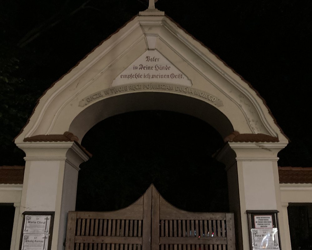 In Lidzbark angekommen, fanden wir schnell einen schönen Platz am Fluss. Ähnlich eines Green Velo Stops, waren zwei schöne Holzpavillons mit Bänken und Tischen aufgebaut, sodass wir die perfekte Infrastruktur zum Kochen hatten. Während ich noch mit meinem Papa telefonierte, in der Hoffnung auf letzte Hinweise auf den alten Hof meines Uropas, lernte Vincent einen jungen Mann kennen. Er stellte sich als Mariusz vor und war hier in Lidzbark geboren und aufgewachsen. Eigentlich wohnte er mittlerweile in Warschau, doch wegen Corona war er im Homeoffice und konnte deshalb hier bei seinen Eltern wohnen. Als wir ihm erzählten, dass wir wohl nur diese Nacht in der Stadt sein würden und morgen direkt weiter fahren wollten, versuchte er uns schnell umzustimmen. Lidzbark sei viel zu schön und habe viel zu viel spannende polnisch-deutsche Geschichte zu bieten, um sich nicht damit zu beschäftigen. Wie sich herausstellte, war er in einem lokalen Geschichtsverein und kannte sich dementsprechend hervorragend aus. Da wir noch essen und ein paar Telefonate führen wollten, verabredeten wir uns auf 22:00. Der erste Stop sollte ein alter Friedhof sein... mitten in der Nacht! Den Weg dorthin legten wir mit unseren Rädern und er mit seinem beeindruckend schnellen Klapp-E-Bike zurück. Vor allem Berg auf zog er uns damit ordentlich davon!