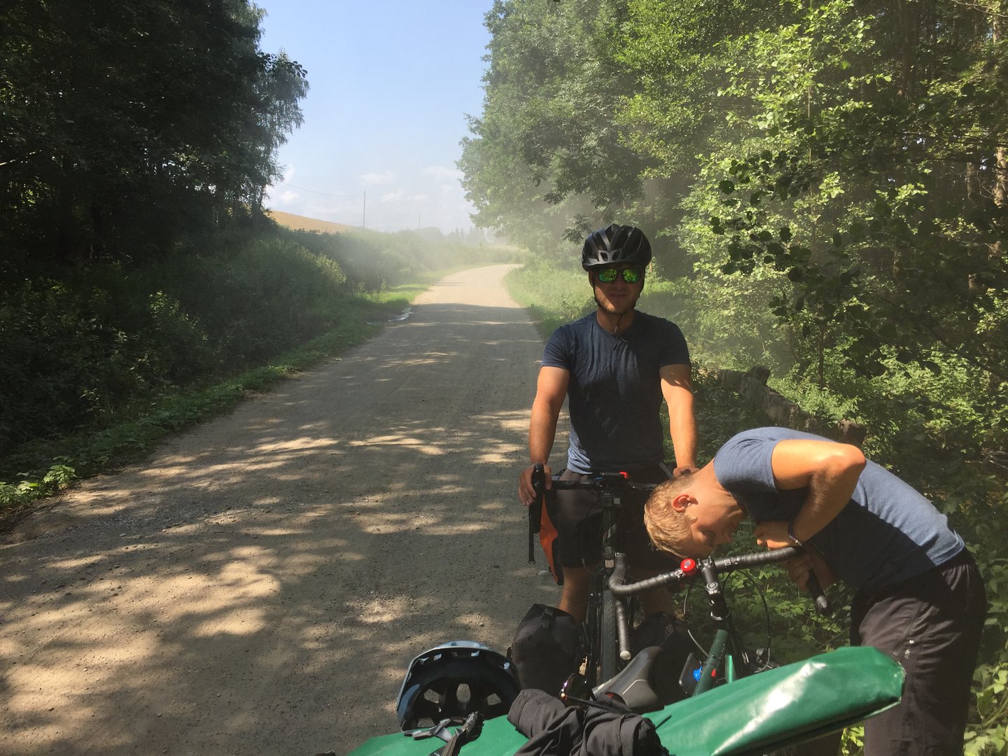 Am nächsten Morgen fuhren wir in Richtung Nowosady. Zur Erinnerung: Hier hatten mein Uropa und meine Uroma einen Hof gehabt, wo auch mein Opa geboren war. Der Weg dahin machte uns schnell klar, dass es sich nicht gerade um eine Metropole handelte: Statt Teer, oder wenigstens Schotter gab es hier erneut nur Sandstraßen. Dies sollte aber gerade geändert werden und dementsprechend rauschten ständig LKWs an uns vorbei in Richtung Baustelle. Jedes mal wurden Unmengen Sand aufgewirbelt und man musste Mund und Augen schließen. Als wir gerade an einer besonders sandigen Passage waren und sich ein Lastwagen an uns vorbei zwängte verlor Vincents Vorderrad den Grip, grub sich tief in den Sand und Fahrrad samt Fahrer stürzten. Glücklicherweise waren noch einige Meter Platz zum LKW und Vincent tat sich auch nicht weh. Lediglich sein Rennlenker nahm eine recht eigenartige Form an, was aber mit Werkzeug und Fingerspitzengefühl wieder in Ordnung gebracht wurde.
