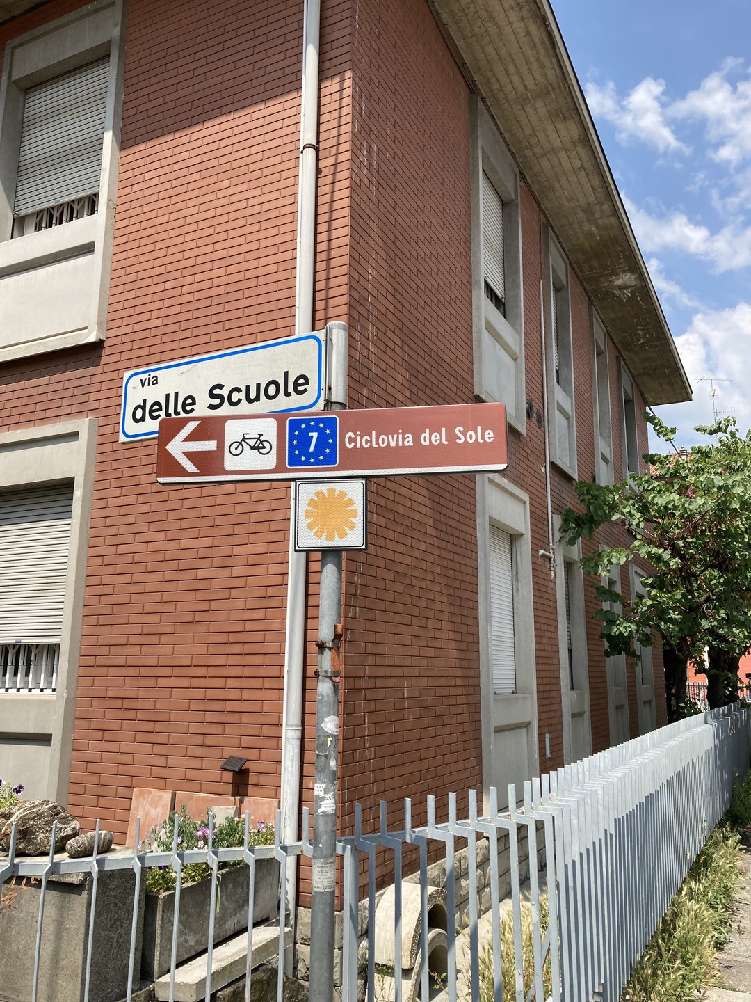 Die Fahrradroute, die wir insgesamt bis dato gefahren sind, haben wir mehr oder weniger deshalb so gewählt, weil sie Teil des Europaradnetzes ist. Genauer ist die Strecke der südliche Teil des Eurovelo 7, der von Sizilien zum Nordkap führt. In der Planung habe ich mich noch dafür ausgesprochen, dass wir bestimmt keine Navigation brauchen, weil es auf einem Europaradweg ja sicherlich genug Schilder geben wird. Und im Zweifel kann man ja eine Karte mitnehmen. Im Nachhinein bin ich froh, dass ich überstimmt wurde. Denn auf über 1000 km Strecke haben wir kein einziges Schild gesehen, was andeutet, dass wir uns auf dem Eurovelo 7 befinden. Wir haben zwischendurch schon überlegt, ob wir selbst mal Schilder aufstellen sollen. Doch nun endlich kam die Bestätigung, dass wir uns nicht verfahren hatten (siehe Bild).