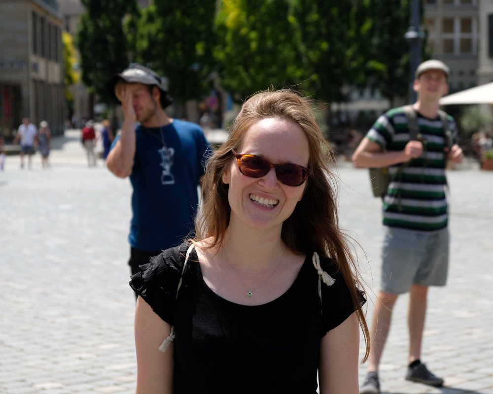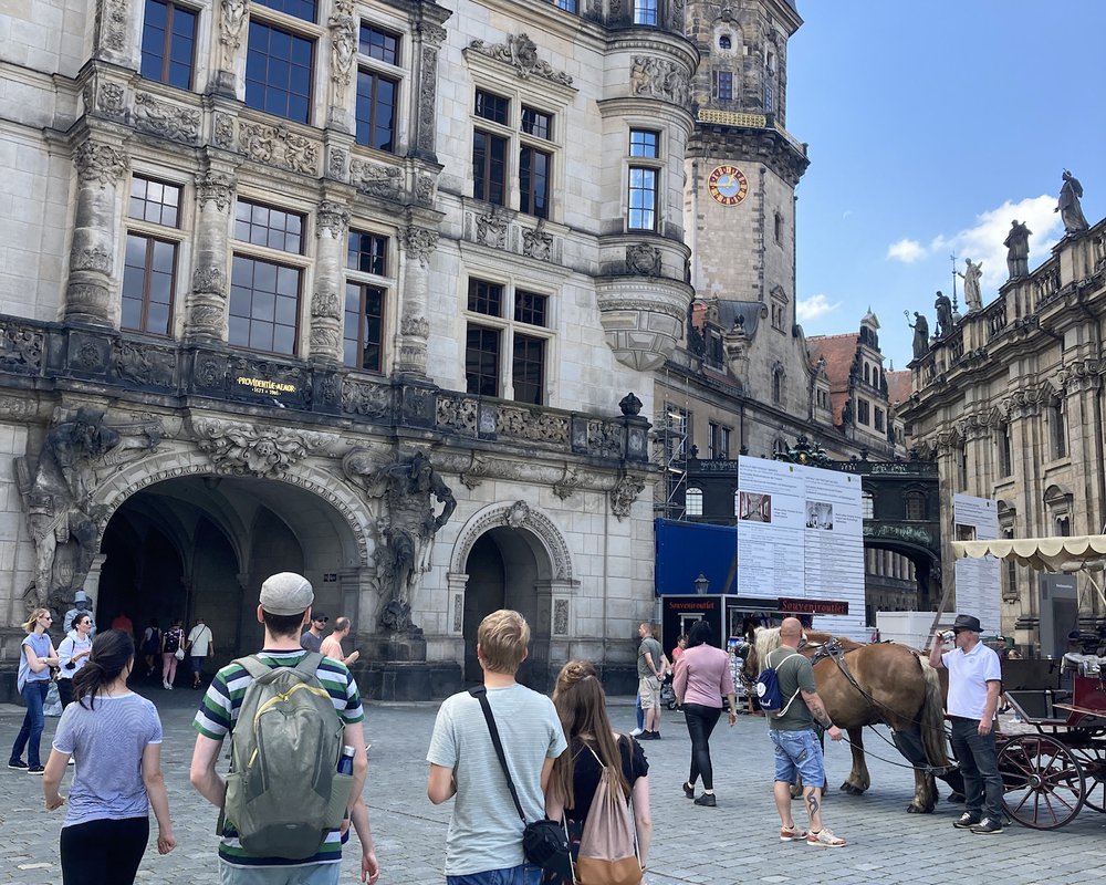 Dort wurden wir bei Rebecca (Schwester von Moritz’ Freundin Adina) in eine wunderschöne WG einquartiert. Nach einem schönen idyllischen Abend ging es dann am Samstag von der Neustadt bis zur Altstadt einmal querbeet durch Dresden. Nachdem wir alles Touristische abgeklappert haben, wollten wir noch beim Globetrotter vorbei. Zum einen weil eine Radtasche von Moritz bereits einen Riss hat und zum anderen weil wir mal wieder Seifennachschub gebrauchen können. Wir setzten uns davor noch auf einen Platz und snackten Brot und Hummus zu Mittag mit Pfirsich als Nachtisch. Und da passierte dann auch das Malheur. Moritz war wohl noch zu sehr inspiriert von Pumas und Biebern und biss beherzt in den Pfirsich mitsamt Stein. Dabei brach dann ein Stück seines Schneidezahns (oder Säbelzahn?) ab. Er ging also zum nicht weit weg gelegenen Notdienst, konnte jedoch nicht direkt drangenommen werden, da es sich nicht um einen Notfall handelte. Immerhin wurde ihm ein Termin für Montag gegeben, das heißt für uns also noch einen weiteren freien Tag.