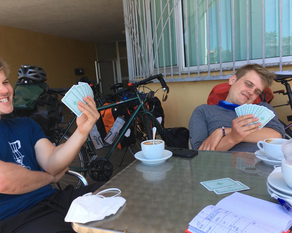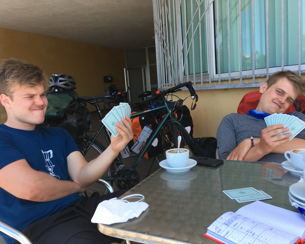 Am Tag nach der bergigen Etappe zogen wir früh morgens los. Anfangs kamen wir dank der ebenen Strecke super voran, wir merkten aber, dass es doch besser für uns ist, das Tempo am Anfang doch noch etwas runterzuschrauben, um unseren Körpern Zeit zu geben, sich ans Radfahren zu gewöhnen. Einen Tag später setzten wir diesen Vorsatz in die Tat um und setzten uns nachmittags um 16:00 Uhr in die erste Bar, die sich anbot. Dort wurden über 4 Stunden hinweg 5 Cappuchini bestellt, 1 Kugel Eis, 6 Birre und 3 Limoncelli. Einige andere Gäste kamen und gingen, darunter auch 3 Italiener in abenteuerlich bunten Fahrradklamotten, doch oft waren wir auch die einzigen Gäste. So ließen wir es uns gut gehen und spielten mal wieder unzählige Runden Skat. Die Italienerin, die in der Bar arbeitete segnete unser Vorhaben, am Strand zu schlafen, ab und so fanden wir 100m weiter einen perfekt geeigneten Schlafplatz mit einem klaren Süßwasserzufluss zum Meer und Büsche, die uns verstecken.