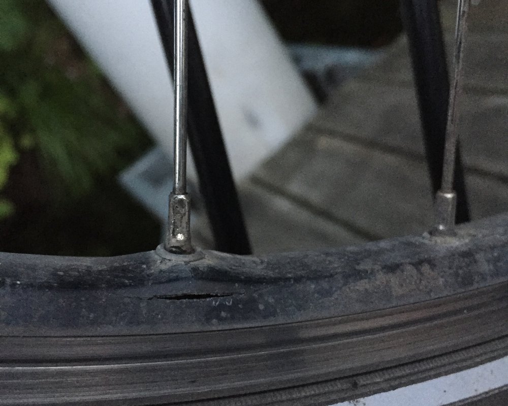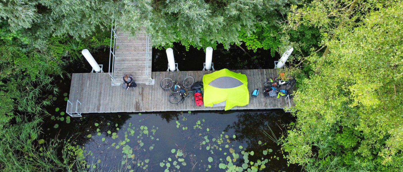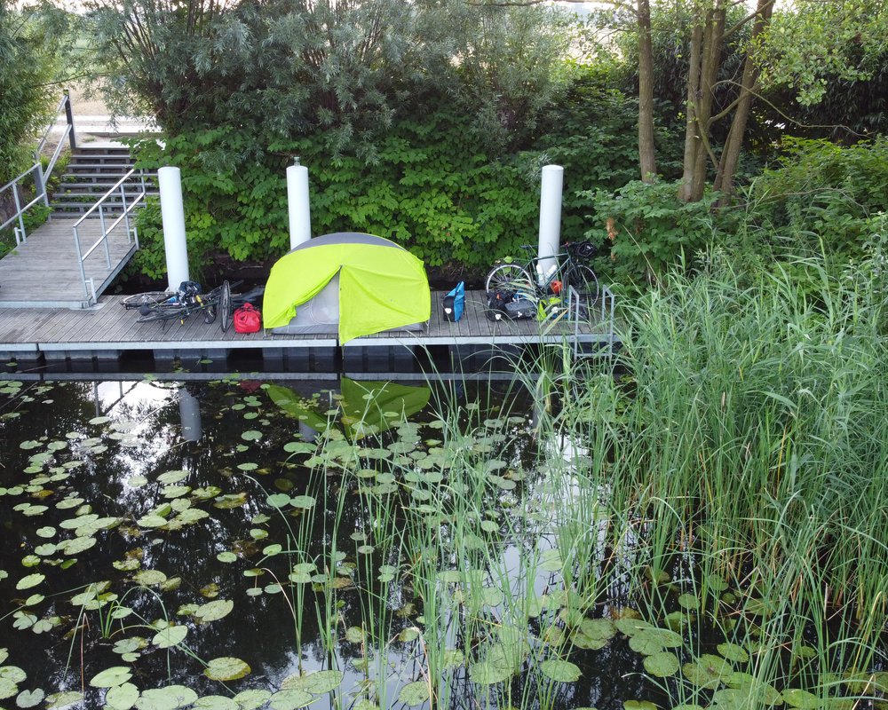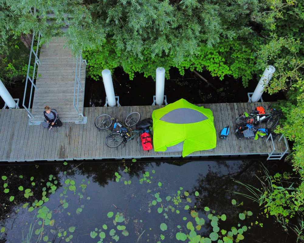 Nach etwa 40 gefahrenen Kilometern - Vincent hing nur noch angestrengt im Windschatten - erspähte Jared einen möglichen Schlafplatz. Am Rande eines kleinen Flusses, von Gebüsch wenigstens halbwegs bedeckt, war ein etwa zehn Meter langer und drei Meter breiter, schwimmender Steg. Unsere Schnellprognose stimmte uns optimistisch, hier unser Zelt irgendwie drauf zu bekommen. Unter normalen Umständen hätte ich dafür plädiert weiterzufahren. Zeitgleich untersuchte allerdings Vincent sein Hinterrad, um festzustellen, ob sich wieder Speichen gelöst hatten. Tatsächlich wackelten einige Speichen nur noch lose herum. Allerdings nicht weil sie sich aus der Felge gelöst hatten, sondern weil sich die Felge AUFgelöst hatte. Bei acht Speichen hatte sich das Gewinde mitsamt einem Stück Felge herausgerissen. Dementsprechend hatte sich das Rad in ein ungefähr rundes Vieleck verwandelt. Eine Weiterfahrt war also erstmal ausgeschlossen und so arrangierten wir uns mit dem Steg. Immerhin war wohl mit Vincents Fitness noch alles in Ordnung... Nachdem wir gekocht hatten, wurde das Zelt auf dem Steg aufgebaut. Mit guten zehn Zentimetern Platz zwischen Zeltwand und Wasser auf beiden Seiten war das ganze kein Problem! Zumindest für mich, da ich ja in der Mitte schlafe.