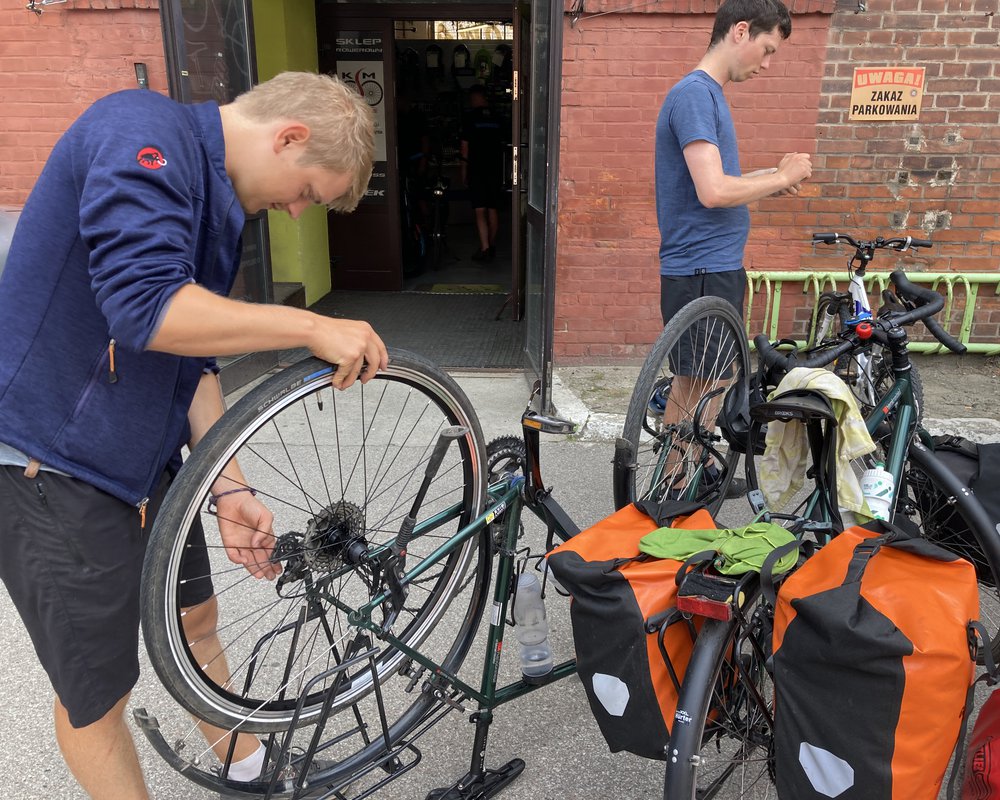 Dank Entlastung rollte alles einigermaßen und wir erreichten recht schnell das etwa 30 km entfernte Elblag. Dort suchten wir einige Zeit nach dem angestrebten Fahrradladen. Da sich die Suche durch ein spannendes Backstein-Industriegebiet zog, wo es so ziemlich jedes Handwerk zu finden gab, hatten wir aber auch daran unsere Freude. Als wir die Radwerkstatt schließlich fanden, waren wir direkt guter Dinge. An der Wand hingen einige dutzend Laufräder und so fand sich auch schnell ein passendes für Vincents Drahtesel. Die beiden Mechaniker, beide etwa in unserem Alter, waren super hilfsbereit und kompetent. Einzig die Frau an der Kasse, möglicherweise die Geschäftsführerin, war nicht so begeistert, wenn wir ständig ihre Mechaniker beanspruchten.
