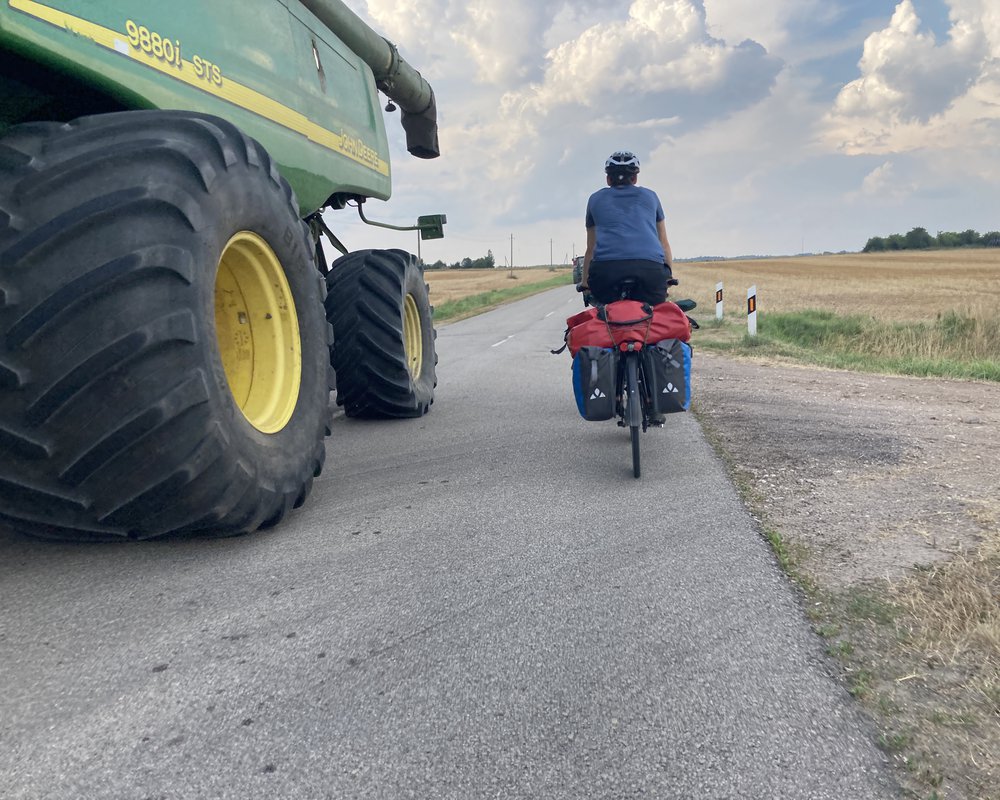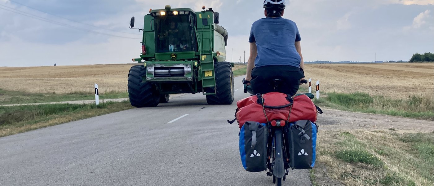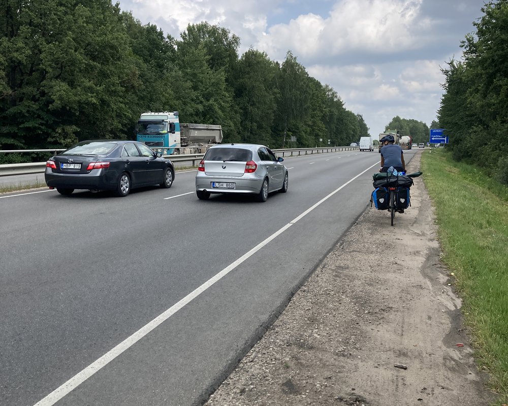 Am nächsten Morgen, die Angeln waren natürlich schon wieder ausgeworfen, stießen wir recht bald auf die recherchierte Route. Es war zwar kein Fernradweg im engeren Sinne, aber die Route versprach der Beschreibung nach zumindest „direkt“ und auf Asphalt zu verlaufen. Trotzdem waren die Straßen hinter Ukmerge zunächst recht stark befahren. Wie so oft in den letzten Tagen blieb uns aber keine andere Wahl, denn die Ausweichroute führte über unzumutbares Pflaster. Der Straßenlärm und die Monotonie versuchten wir uns mit Podcasts auf einem Ohr etwas erträglicher zu machen. Kurz vor Anyksciai versuchten wir trotzdem nochmal auf eigene Faust der Straße auszuweichen. Leider verwandelte sich der solide Schotterweg in einen erdig-sandigen Waldweg. Den geneigten Leser*innen werden vielleicht noch die größten Fehleinschätzungen von Jared, Katha und mir bekannt vorkommen. Auf dem Waldweg kam es dann tatsächlich auch mal zu einer eklatanten Fehleinschätzung von Moritz‘s Seite. Glücklicherweise konnten wir diese bequem aus dem Trockenen heraus fotografisch dokumentieren: