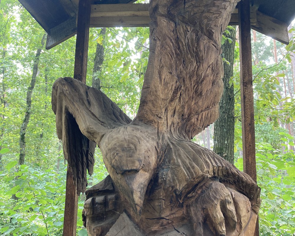 Wie gewöhnlich, wenn wir mal ein festes Dach über dem Kopf haben, reizten wir die Check-Out-Zeit bis auf die letzte Minute aus und radelten aus der Kulturhauptstadt Kaunas in Richtung Ukmerge raus. Wir versuchten die vermeintlichen Vorzüge der Zivilisation zu nutzen, um an einen Corona-Test zu kommen. Haben wir in Berlin noch darüber schmunzeln müssen, dass jeder Dönerladen, Antiquitätenhändler, Puff oder auch ein Lastenrad ein Testangebot hat, merkten wir, dass das in Litauen nicht ganz so einfach ist. Sowohl an der Touristeninfo als auch bei einem Testzentrum selbst, konnte man uns „so kurzfristig“ nicht weiterhelfen. Nachdem wir mit der offiziellen Hotline telefoniert hatten realisierten wir, dass es an diesem Tag nichts mehr mit einem Test wird. Etwas ernüchtert fuhren wir in Richtung Ukmerge. Leider gibt es in Litauen kaum Fernradwege und so hatten wir nach längerer Recherche online eine Navigationsroute von Vilnius nach Riga gefunden. Auf diese Route wollten wir bei Ukmerge stoßen. Auf dem Weg dorthin musste improvisiert werden. Wir schoben unsere Räder über sandige Waldwege, fuhren ein Stück Autobahn und mussten uns bei einer Brücke auf dem Gelände einer Kiesgrube dünn machen, bevor wir die vollbepackten Räder auch noch über eine Autoschranke heben mussten. Zwischendrin waren wir froh, als wir einen netten Rastplatz in einem Waldstück fanden mit sehr netten Holzskulpturen. Die Pause versüßten wir uns mit dem Olympialivestream, was mit unserer neuen tollen SIM-Karte überall möglich ist.