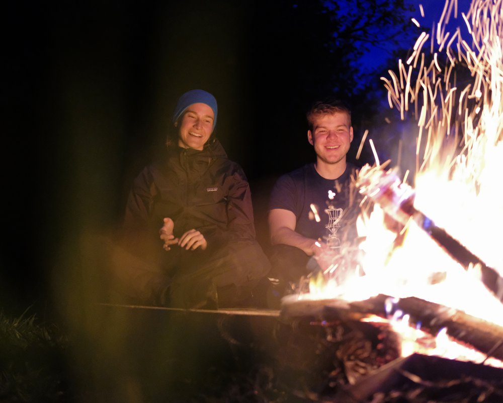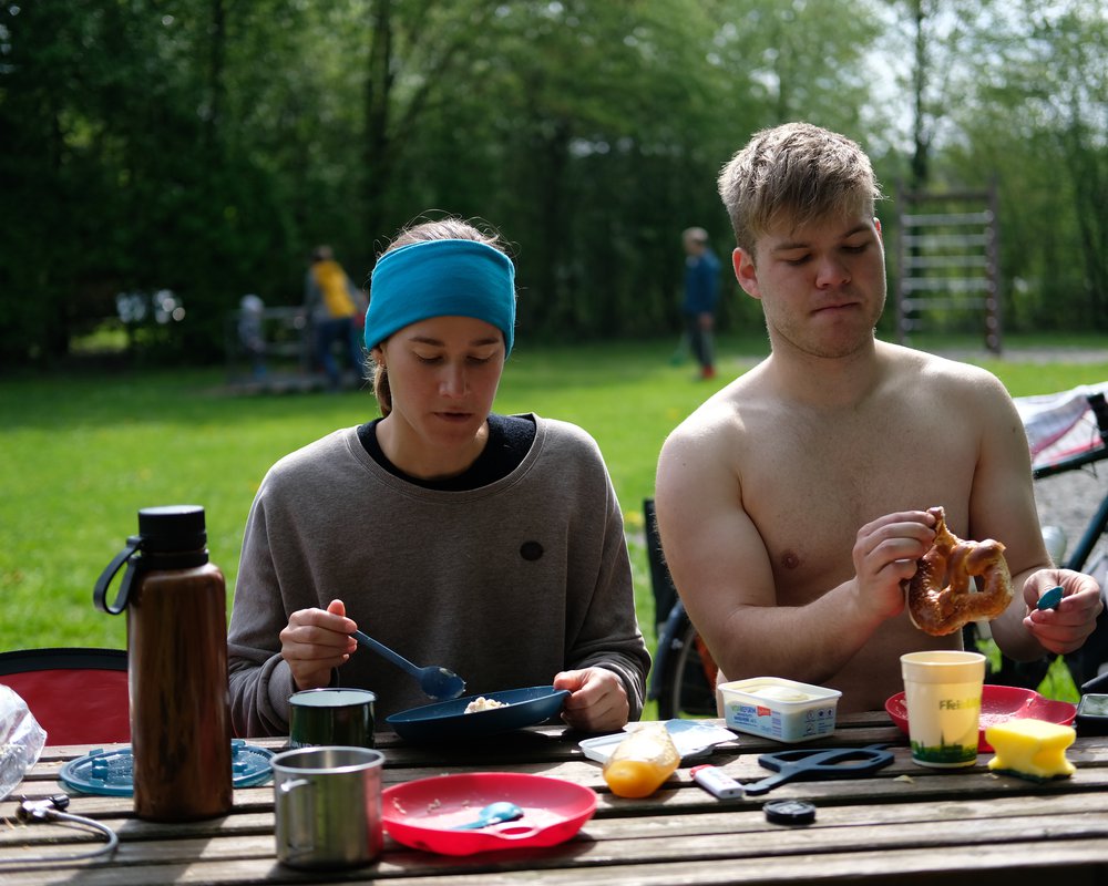 Die nächsten Kilometer führten uns entlang des Altmühltals Richtung Eichstätt. Die schöne Felsreihe, genannt 12 Apostel‘, ließen es kurz in den Fingern jucken und weckten die Sehnsucht nach der Boulderei. Schließlich wurde es Zeit für die Schlafplatzsuche. Vincent hatte dafür bereits einen Spot im Kopf, der dann aber leider von Vatertagsfeiernden bereits belegt war. Die Gruppe spendierte uns 3 Bier und wies uns den Weg zu einem Schlafplatz unweit auf einem Hügel. Dort angekommen konnten wir bei einem kleinen, aber mühsam erkämpften Lagerfeuer den Abend ausklingen lassen. Gestärkt durch die bereichernden Gespräche und leckerem Essen über den Tag ließ es sich schon deutlich besser schlafen als in der vorigen Nacht.