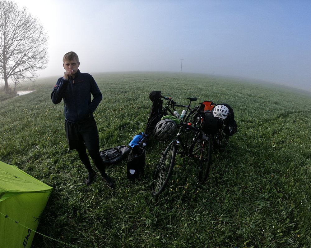 Zunächst einmal die gute Nachricht: das Zelt hält dicht! Angenehm war die Nacht trotzdem nicht. Immerhin ließ der Regen bis in den Morgen nach und wir konnten unser Hab und Gut soweit ohne zusätzliche Nässe wieder einpacken. Kaum waren unsere Räder wieder auf dem Teer, merkte ich: „Mist, Platten hinten... und das schon so früh.“ Direkt musste also der erste der beiden Ersatzschläuche herhalten und der Wechsel ging auch sehr fix über die Bühne. Schlussendlich waren wir wieder unterwegs. Als der morgendliche Nebel sich verkroch und die ersten Sonnenstrahlen zu spüren waren, hob sich die Stimmung merklich. Beim ersten Stopp auf einem Spielplatz nutzten wir die Gerätschaften direkt, um alles aufzuhängen und trockener zu bekommen und glücklicherweise wurde das „Wäschegerät“ von keinem der Kinder anvisiert, die später auf den Spielplatz kamen. Während Katha und Vincent das Frühstück vorbereiteten, machte ich mich auf den Weg zur Dorfmitte um Wasser bei einem Brunnen zu holen. Leider war der Brunnen an der Kirche bereits versiegt. Zum Glück bemerkte mich ein Anwohner, als ich etwas planlos rumstand und bot direkt seinen Gartenanschluss an, vielen Dank nochmal!