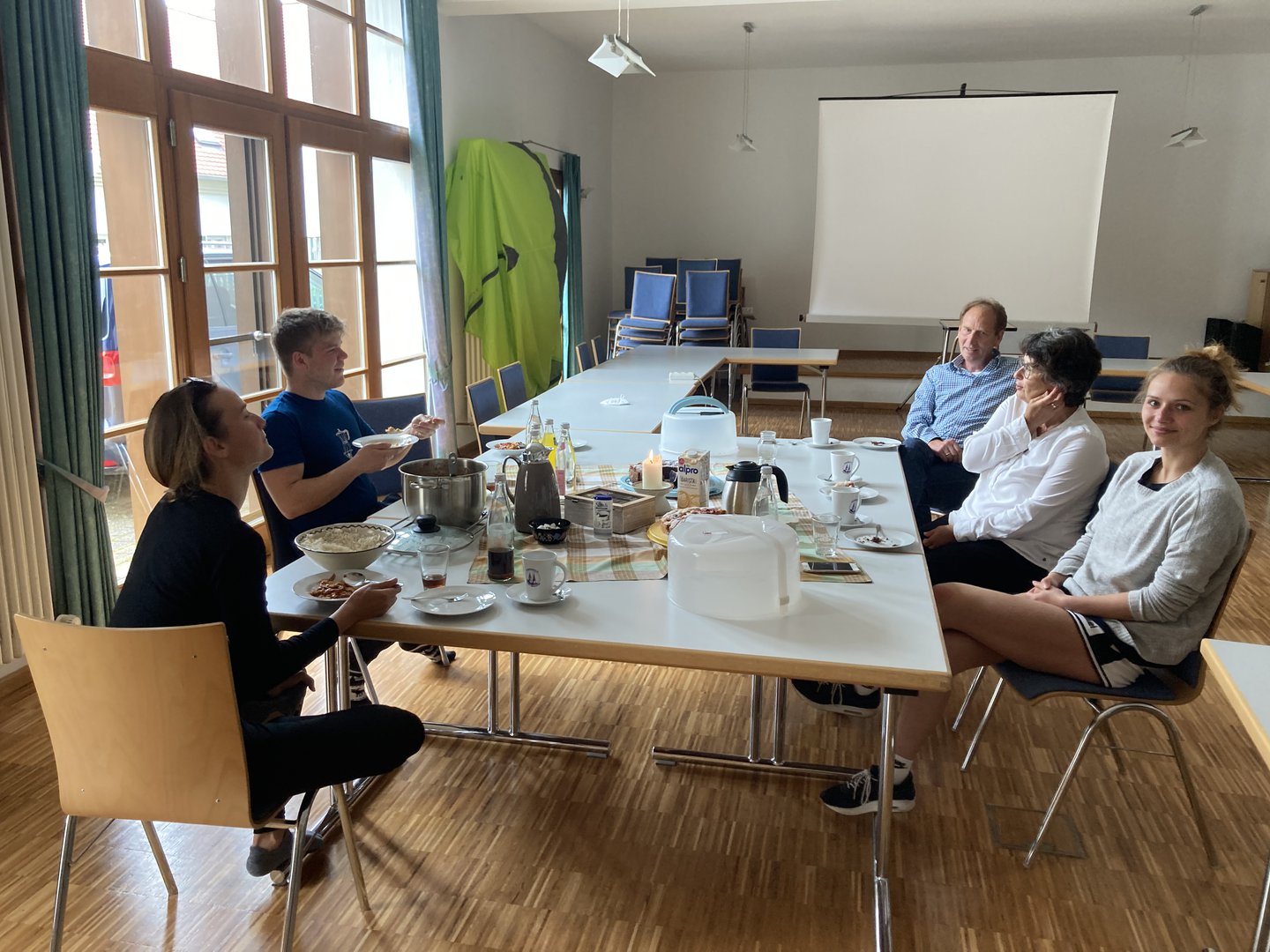 Wir wurden sehr herzlich im Gemeindehaus empfangen, wo wir erstmal begannen, alles noch nicht ganz Trockene über jegliche Heizungen zu hängen. Im regen Gespräch mit Myriam, Martin und Theresa fühlte es sich schnell so an, als wäre kaum Zeit vergangen nach der mittlerweile doch fast 7 Jahre zurückliegenden gemeinsamen Zeit. Martin ist nach wie vor ein absoluter Ökopionier und wir waren alle sehr gebannt von seinen Visionen der Agro-Forstwirtschaft. Dabei wird Forstwirtschaft und Landwirtschaft kombiniert, beispielsweise durch Anpflanzung von Walnussbäumen auf Weideflächen. Dadurch lässt sich der Platz optimieren, sowie die Fläche besser schützen gegen rapide Austrocknung. Das erinnerte mich direkt an die Agro-Photovoltaik, die einen ähnlichen Ansatz hat, jedoch mit der Stromgewinnungskomponente. Außerdem fährt die Familie bereits den zweiten Elektrowagen (oder dritten?) und der alt-bekannte Nissan Leaf, den ich bereits 2013 kurz fahren durfte, lebt auch noch, E-Mobilität scheint also auch längerfristig zu funktionieren. Mit Pfarrerin Myriam wussten wir zunächst nicht, mit welch aufgehendem Stern am Influencer Firmament wir es hier zu tun haben. Der anfangs Corona-bedingte Youtube Kanal scheint wohl regelrecht durch die Decke zu gehen und wir sind mehr als gespannt, uns bei der nächsten WLAN Gelegenheit eine Predigt anzuschauen.