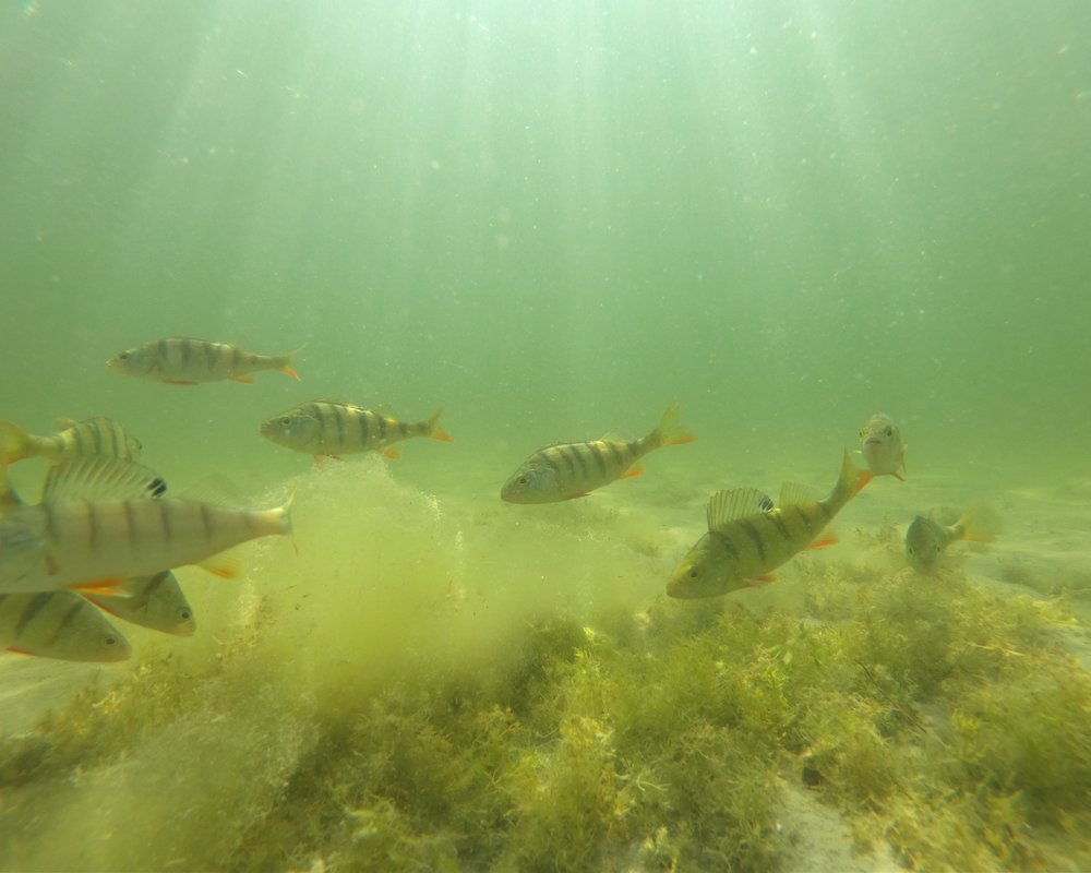 Mittags machten wir Pause an einem kleinen See. Nachdem wir die Fahrräder und uns geputzt hatten, entdeckten wir beim Baden einige schöne Fische im Wasser. Es machte sich bezahlt, dass ich meine 2,99€-Billo-Chlorbrille, die ich in Passau gekauft hatte, um ein paar Bahnen im Freibad zu schwimmen, seit fast 2000km mit mir rumschleppe. Bewaffnet mit Brille und GoPro versuchten wir uns mit den Flussbarschen anzufreunden.