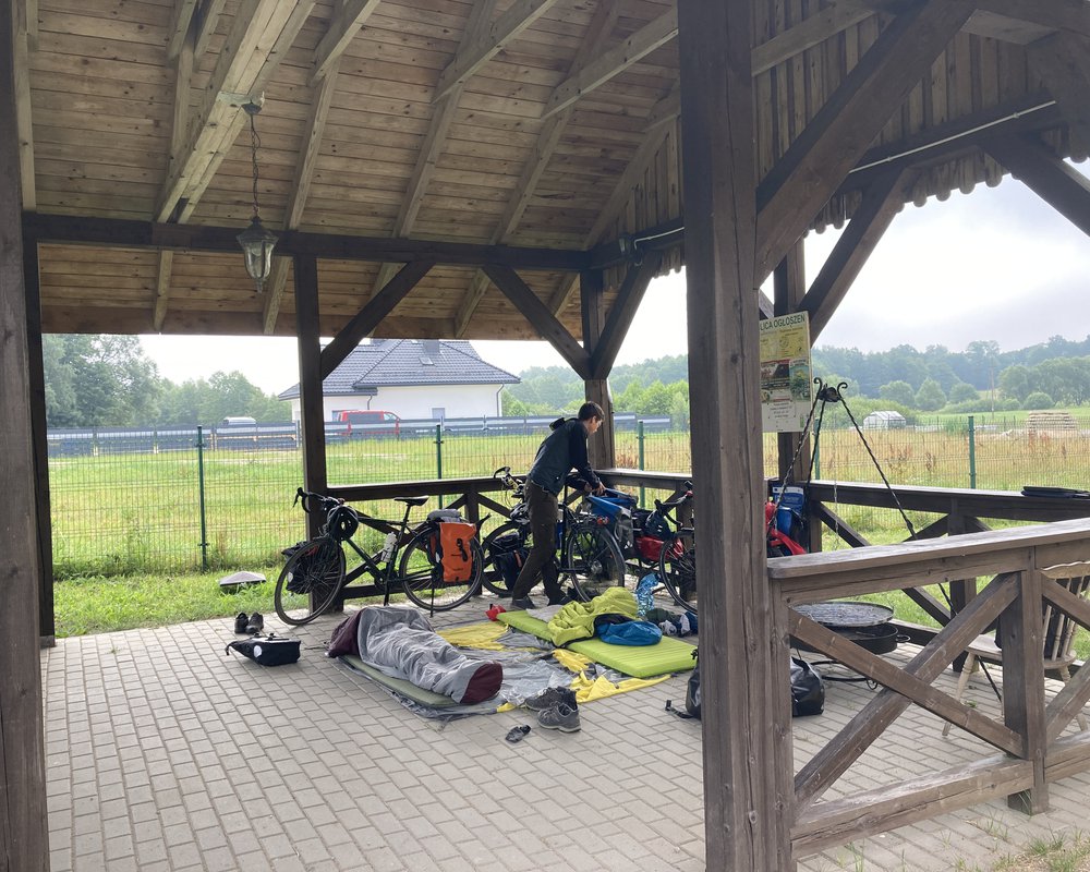 Wir fuhren auf polnischer Seite noch ein Stückchen weiter. Bei einer Einkaufspause trafen wir eine ganzes Feld von Gravelbike-Fahrern, die augenscheinlich an einem Rennen teilnahmen. Aus dem Erschöpfungszustand der Fahrer und der Qualität der Ausrüstung folgerten wir, dass das Rennen nicht ganz ohne sein muss und tatsächlich recherchierten wir, dass es sich hierbei um ein Crosscountryrennen über 200km/500km handelt. Im Gespräch erfuhr Jared, dass einige der Fahrer garnicht schlafen, andere wiederum hatten auch ein Zelt dabei. Auf jeden Fall ist die knapp bemessene Karenzzeit von 72h einzuhalten. Wie wir da wohl mit unseren bepackten Eseln so performen würden?
