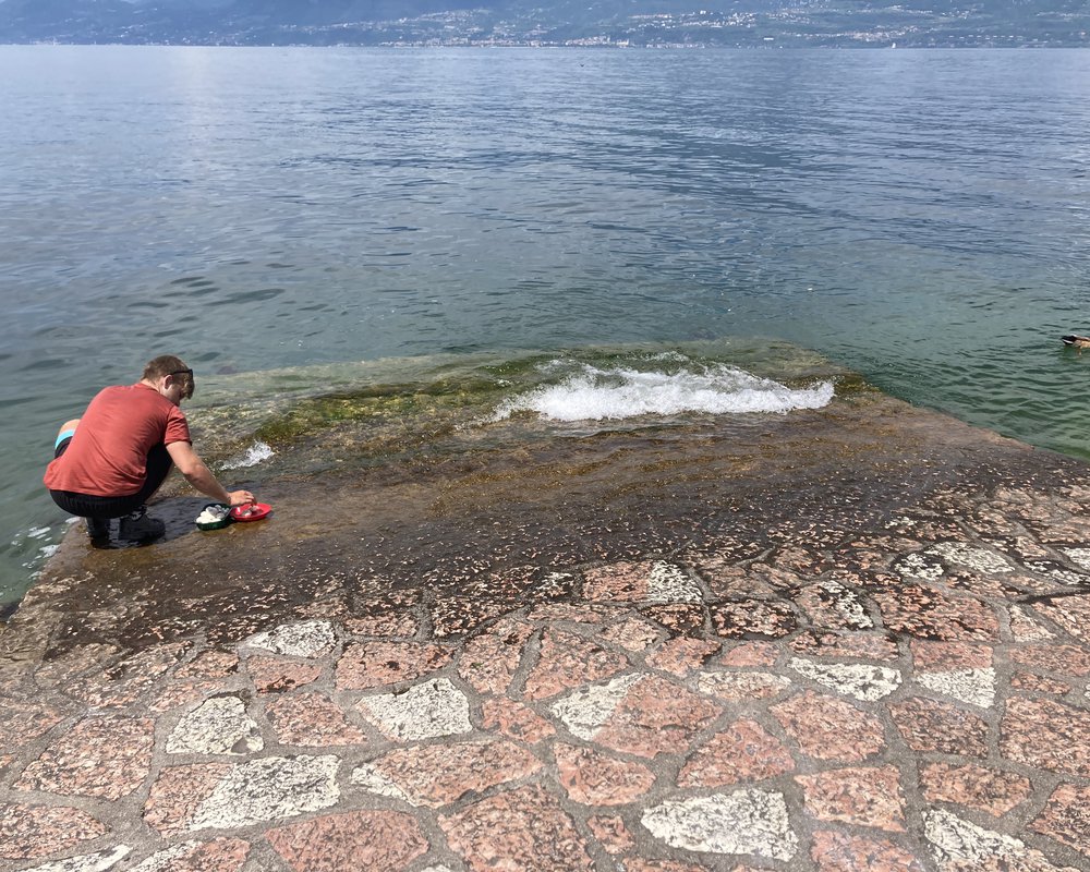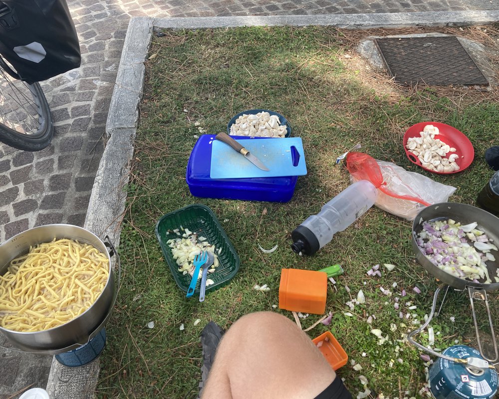 Etwas überfordert mit der plötzlichen Veränderung der Landschaft und dem Tourismus suchten wir um die Mittagszeit mal wieder einen Platz zum Essen kochen. Entlang der Seepromenade und hinter ein paar sehr edlen Restaurants fanden wir schließlich eine Bank mit etwas grünem Fleck und Zugang zum See. Dort gab es dann….