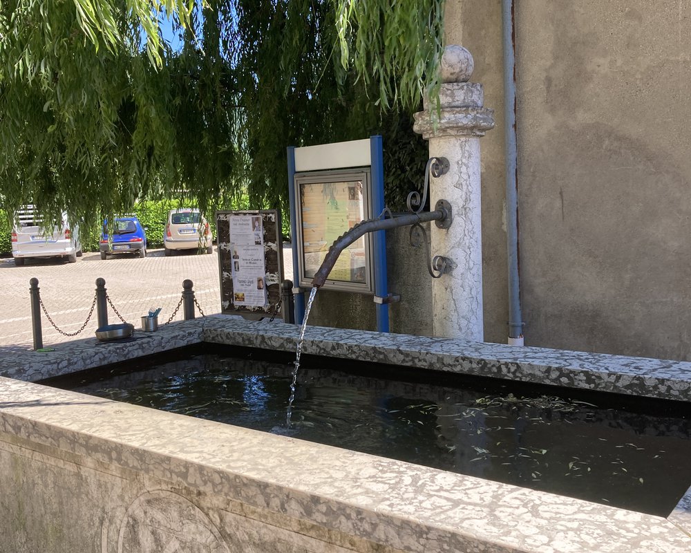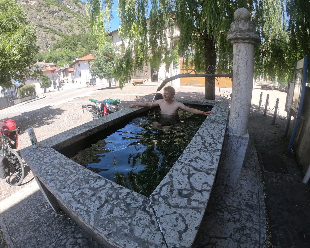 Nach Wochen in Süd- und Mittelitalien mit schlecht ausgeschilderten und maroden Radwegen (siehe hier), war der Radweg an der Etsch ein absoluter Segen. Wir konnten gut Strecke machen und entschieden uns den Kalterer See anzusteuern. Zur Mittagszeit, in der die Sonne am brachialsten vom Himmel brezelte, fanden wir eine wunderschöne Abkühlung und Erfrischung in einem Dorfbrunnen.