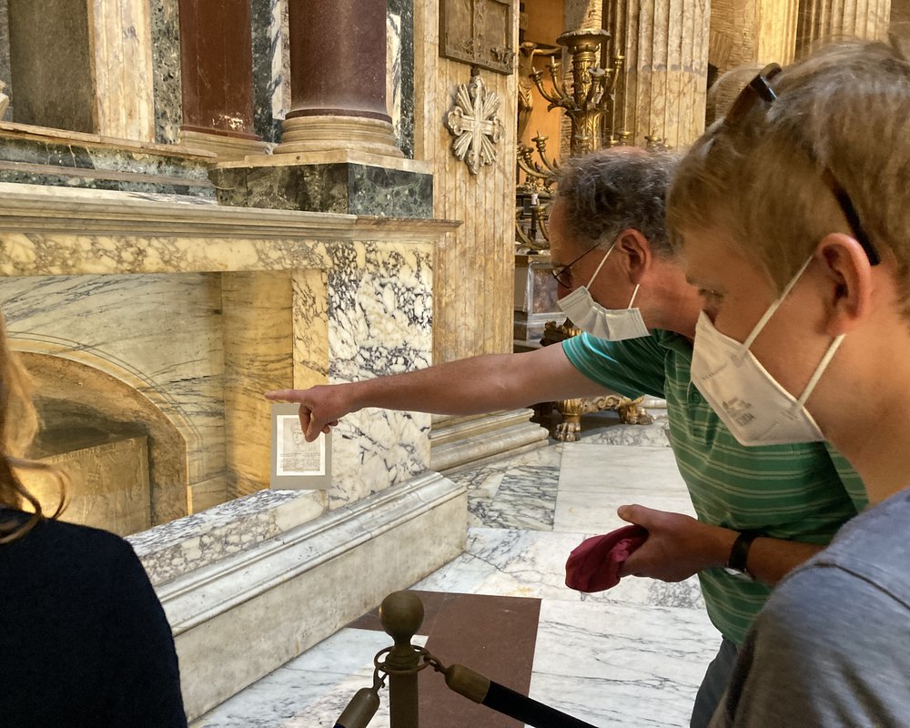 Weiter ging es über den Trevibrunnen - noch nie so leer erlebt - zum Pantheon. Als ich gerade wieder kläglich versuchte mit meinem Halbwissen mir etwas über die Geschichte des Pantheons zusammen zu dichten, trafen wir meinen alten Lateinlehrer mitten im Pantheon. Was für ein Zufall! Ich wusste zwar zufällig, dass er gerade in Italien im Urlaub war, aber dass er gerade heute in Rom und gerade jetzt im Pantheon war... Die Wiedersehensfreude war groß. Anschließend wurde ich aber erst einmal zur Abfrage ans Grab von Raffael gezerrt. An der Inschrift scheiterte ich aber - trotz Lateinabi - kläglich. Siggi lud uns zu seiner Familie ins Urlaubsquartier nach Montefiascone ein. Wir freuten uns schon riesig!