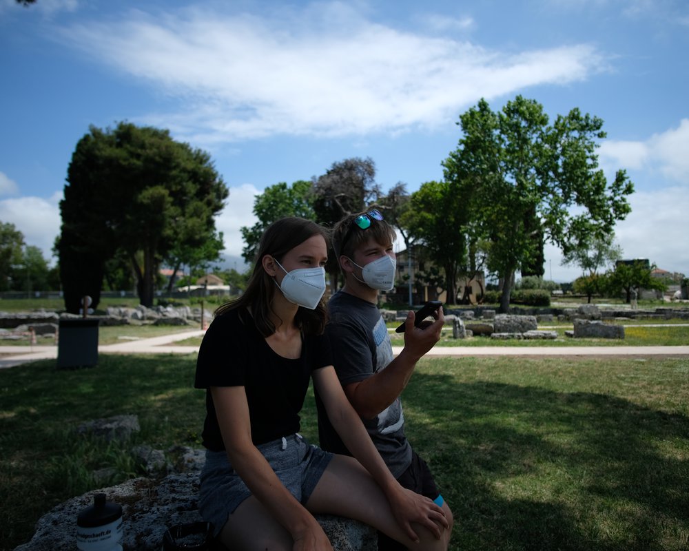 Vor 3 Wochen hat uns Albrecht (Vincents Papa) wärmstens epfohlen, dort vorbeizuschauen. Kathas Verdacht, dass sich dahinter eine Pilgerreise der Pesto-Verrückten verbirgt war schnell verflogen als wir die Tempelruinen erblickten. Glücklicherweise bot uns Albrecht sogar eine Direktverbindung zu einem Audioguide an (seine Handynummer) und so waren wir bestens aufgehoben. Als er uns schließlich willkommen hieß im antiken Griechenland war ich kurzzeitig verwirrt, ob Vincent seinem Papa das richtig erklärt hatte mit dem Routenplan unserer Radreise. Schnell stellte sich heraus, dass jedoch unsere unzureichende Bildung das Manko darstellte und tatsächlich die Griechen um ca. 500 v. Chr. diese Kolonie erbauten. Unsere mobile Wissensquelle lockte schließlich tatsächlich sogar weitere Wissensdurstige an und so fragte schließlich ein älteres Paar, wo man denn diese Audiodatei herbekommt. Da mussten wir lachend Albrecht kurz unterbrechen, aber luden sie schließlich ein, einfach mitzulauschen. So versammelten wir uns zu fünft um ein auf laut gestelltes Telefon herum und lernten eine ganze Menge, von uraltem Honig, über Steinbauwerke, die eigentlich vom Holzbau inspiriert sind und von der speziellen Art der Säulen, die ihre dickste Stelle garnicht direkt unten haben sondern knapp über dem Auflagepunkt am Boden.
